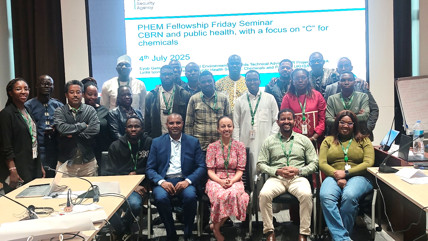 The UK Health Security Agency (UKHSA) International Health Regulations Strengthening Project (IHR-SP) and Africa Centres for Disease Control and Prevention (Africa CDC) delivered a first of its kind hybrid seminar on chemical, biological, radiological and nuclear (CBRN) hazards to the Public Health Emergency Management (PHEM) Fellows from 18 African Union Member States on 4 July 2025. The one-day seminar, hosted at the Africa CDC headquarters, marked the first time since PHEM Fellowship began in 2023 that PHEM Fellows received dedicated CBRN training – helping to build Africa’s capacity to detect, prevent and respond to CBRN threats.