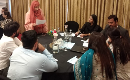 Image: partner representatives from Sindh (left) and group exercises taking place (right)